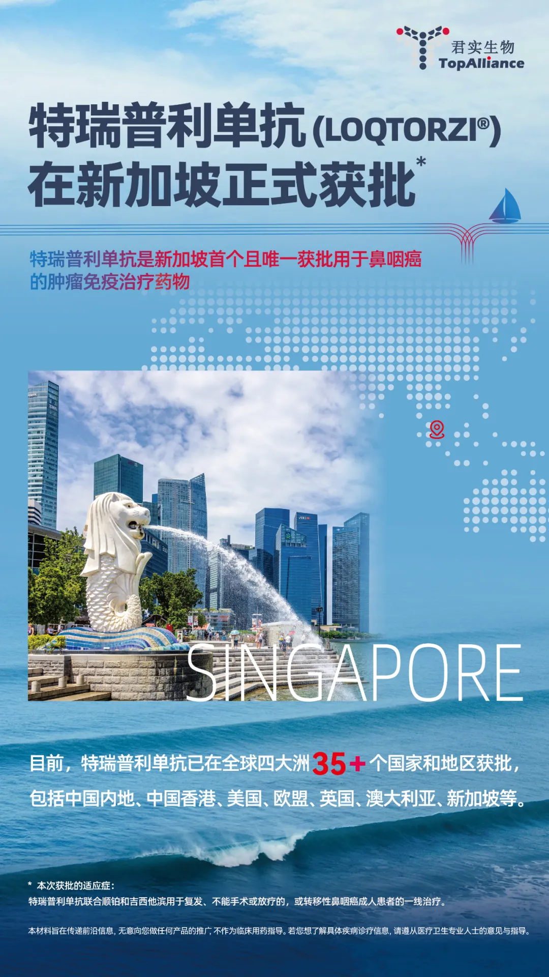特瑞普利单抗在新加坡获批标志着我们正式登陆东南亚市场。东南亚是鼻咽癌的高发地区之一,我们很高兴能够将鼻咽癌领域具有划时代意义的创新疗法带给东南亚患者,以改变当地的治疗格局。目前,特瑞普利单抗已成功在全球四个大洲的超过35个国家和地区获批上市。我们将继续深化‘立足中国,布局全球’的国际化战略,推动中国创新药造福世界患者。