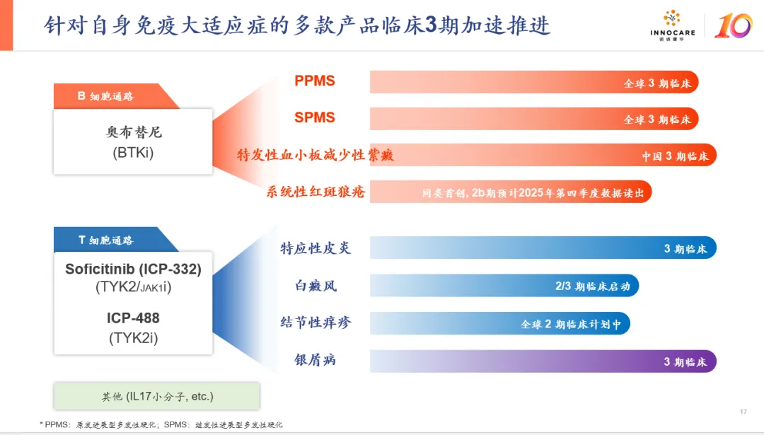 得益于奥布替尼早期在MS的布局,诺诚健华在自免的临床积累了大量经验,目前自免核心管线都推到了III期,也让公司能在自免在国内爆发的前夜得以加速落地。