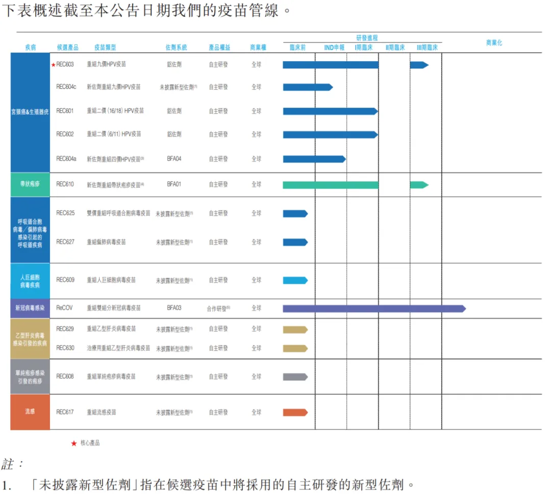 重组九价HPV疫苗REC603:正在中国进行III期临床试验,并已进入第42个月的观察阶段。此疫苗预期能预防约90%的宫颈癌及肛门生殖器疣。根据计划,将在满足特定条件后于2025年提交生物制品许可申请(BLA)。