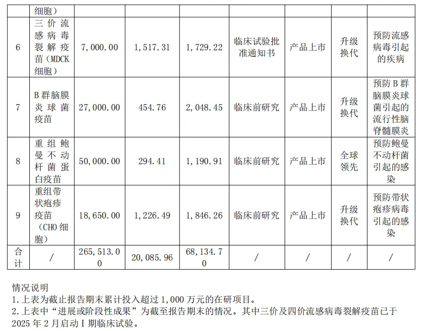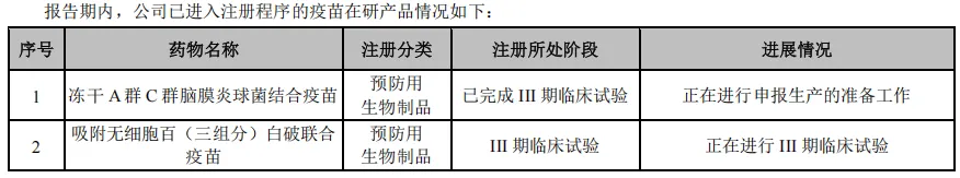 目前,公司正努力推进A群C群脑膜炎球菌多糖结合疫苗、吸附无细胞百(三组分)白破联合疫苗、冻干b型流感嗜血杆菌结合疫苗(Hib疫苗)、重组带状疱疹疫苗、流感病毒mRNA
