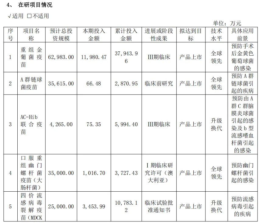其中,重组金葡菌疫苗是目前国内唯一开展临床研究的重组金葡菌疫苗,Ⅲ期临床试验计划入组6000例,截至报告期末,已完成入组5000余例;口服重组幽门螺杆菌疫苗(大肠杆菌)在澳大利亚获得Ⅰ期临床试验许可;三价及四价流感病毒裂解疫苗(MDCK细胞)已获药物临床试验通知书。
