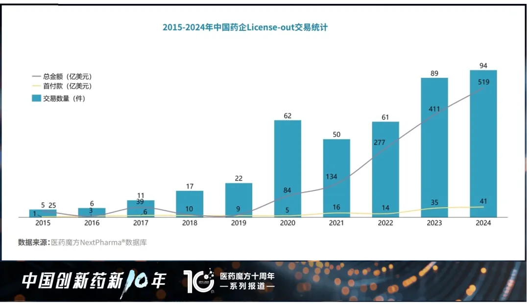 2023年,中国创新药企获得的BD首付款首次超过IPO募资总额,并且是后者的近两倍,引起业内哗然;2024年,BD“狂飙”已然成为行业常态,医药魔方统计,2024年中国药企license-out首付款已达41亿美元,超过IPO募资总额后,也已逼近同期一级市场融资总额。