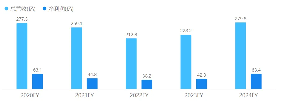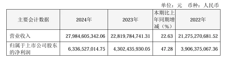 其中显示,2024年恒瑞医药营业收入279.85亿元,同比增长22.63%;归属于上市公司股东的净利润63.37亿元,同比增长47.28%;归属于上市公司股东的扣非净利润为61.78亿元,同比增长49.18%。