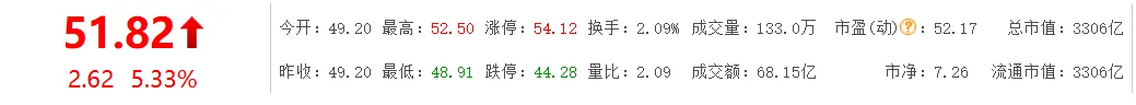 交出漂亮的成绩,恒瑞医药的股价也在节节攀升。截至目前,恒瑞医药的股价为51.82元,总市值为3306亿元。