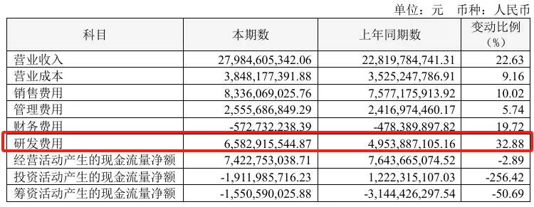此外,为保证创新产出,恒瑞医药持续加大创新力度,维持较高的研发投入,报告期内累计研发投入82.28亿元,其中费用化研发投入65.83亿元,同比增长32.88%。