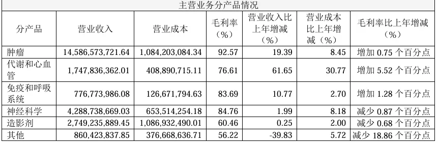 肿瘤2024年营收为145.87亿元,同比增长19.39%;免疫和呼吸系统营收为7.77亿元,同比增长10.77%;神经科学营收为42.89亿元,同比增加1.99%;造影剂营收为27.49亿元,同比增长0.25%。其他营收为8.60亿元,同比下滑39.83%。