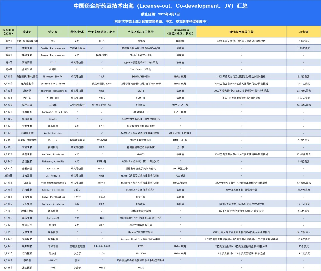 据药时代不完全统计,2025年第一季度中国医药出海共计33笔,已披露金额超362亿美元。其中,启德医药与Biohaven、韩国AimedBio的大宗商务战略合作最为亮眼,协议总金额超130亿美元。