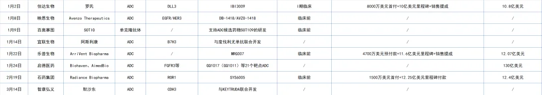 Biotech更愿意尝试新靶点的早资产。除了上述两笔联用组合,其他6笔交易均为临床早期阶段(信达生物的IBI3009为临床一期,其余均为临床前),且8笔交易中无HER2、Trop2这样的热门靶点。