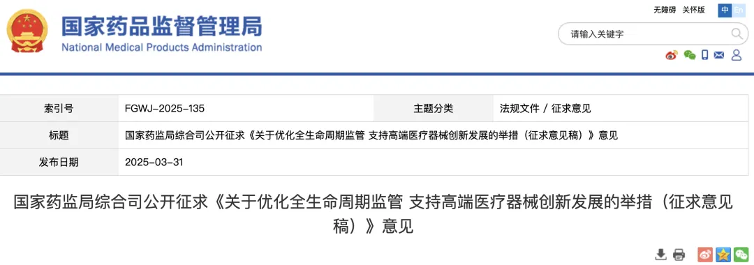 3月31日,国家药监局发布《关于优化全生命周期监管支持高端医疗器械创新发展的举措》,聚焦医疗器械行业的全生命周期监管优化。