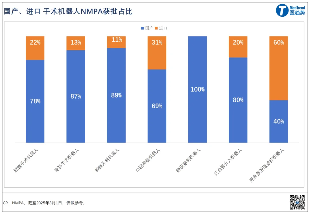 第三,国产势力崛起。仅从产品获批数量来看,目前,国产手术机器人已全面超过进口。