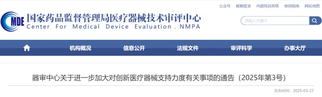 3月27日,国家药监局医疗器械技术审评中心发布《关于进一步加强对创新医疗器械支持力度有关事项的通告(2025年第3号)》(以下简称《通告》),明确通过“提前介入、一企一策、全程指导、研审联动”机制,加速创新医疗器械审评审批进程。