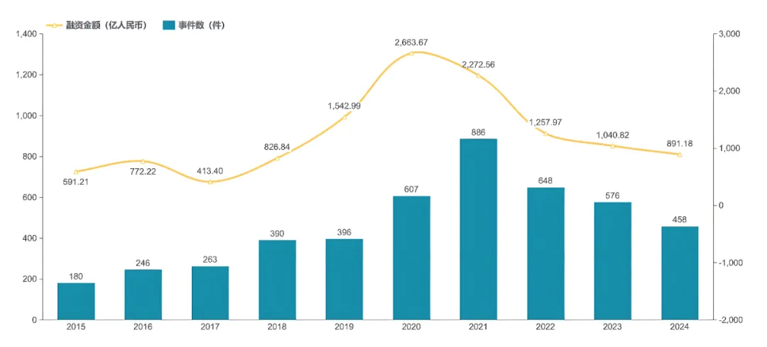 回首过去十年,我国创新药领域在一、二级市场的累计融资规模已突破 1.23 万亿元人民币。从 2015 年开始,创新药领域的投融资活动开始崭露头角。在 2015-2020 年这段时间里,行业融资规模呈现出波动上升的态势,2021 年更是达到了巅峰,当年投资事件多达 886 起,融资规模高达 2272.56 亿元。随后的几年虽稍有所回落,但在行业总体表现依旧表现不凡 [1]。