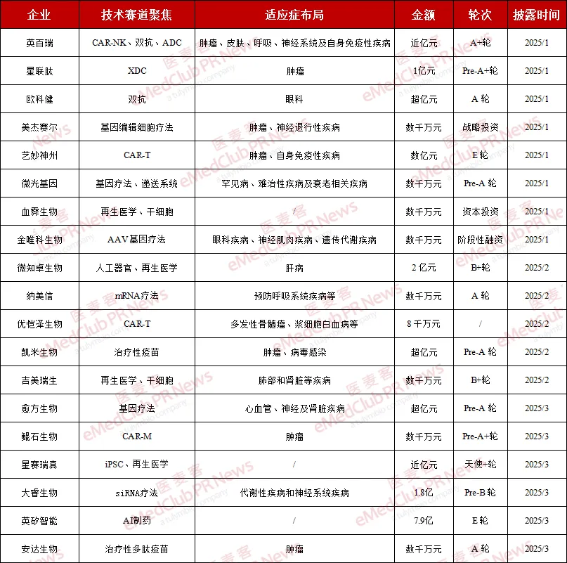 在 2025 年 Q1 的融资中表现亮眼,英百瑞、艺妙神州、优恺泽生物、美杰赛尔以及鲲石生物 5 家布局免疫细胞疗法的企业获得了融资,累计融资总金额达数亿元。