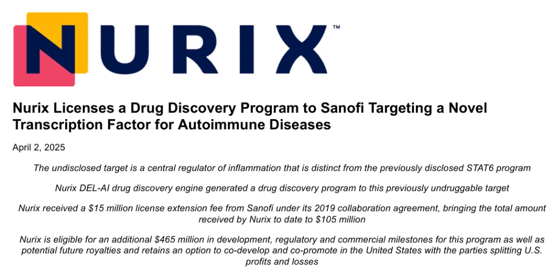 根据合作协议,Nurix正在部署其专有的DEL-AI药物发现平台,以鉴定使用E3连接酶诱导特定药物靶标降解的新型药物。赛诺菲有权对这项工作产生的候选药物进行许可,Nurix有权在研究后在美国共同开发和共同推广多达两种未来的产品,以评估剂量、疗效和安全性,提供临床概念证明。对于Nurix选择共同开发和共同推广的项目,双方将平均分配美国的损益,Nurix将有资格获得所有可选产品在美国以外销售的特许权使用费。对于Nurix没有行使选择权的项目,Nurix将根据全球开发和销售情况获得里程碑和版税。2019年12月签署协议后,赛诺菲向Nurix支付了5500万美元的预付款,一年后又支付了2200万美元以扩大合作范围。包括这次1500万美元的许可证延期费在内,作为此次合作的一部分,Nurix已从赛诺菲获得1.05亿美元,并且每个许可项目仍有资格获得高达4.65亿美元的开发、监管和商业里程碑,以及未来销售的特许权使用费。