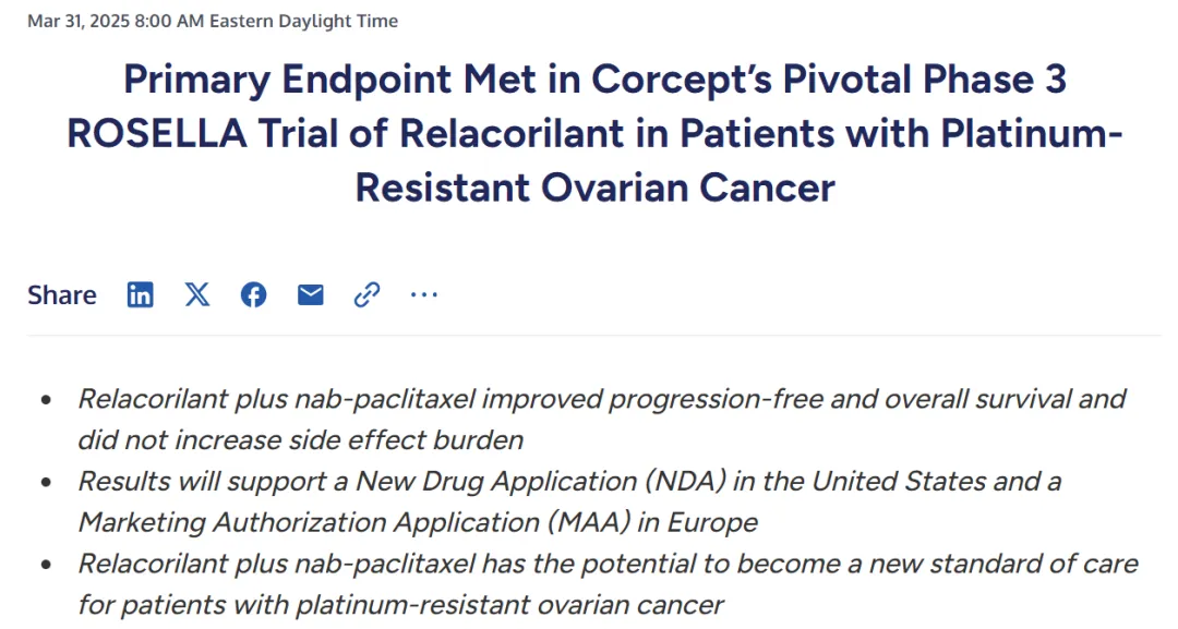 3月31日,加利福尼亚州,Corcept Therapeutics(NASDAQ:CORT)宣布根据盲法独立中心审查(PFS-BICR)的评估,该公司Relacorilant与白蛋白紫杉醇联合治疗铂类耐药卵巢癌症患者中进行的关键性三期试验ROSELLA达到了改善无进展生存率的主要终点。Relacorilant是一款口服选择性糖皮质激素受体(GR)拮抗剂,通过与GR结合而不是与身体的其他激素受体结合来调节皮质醇活性。