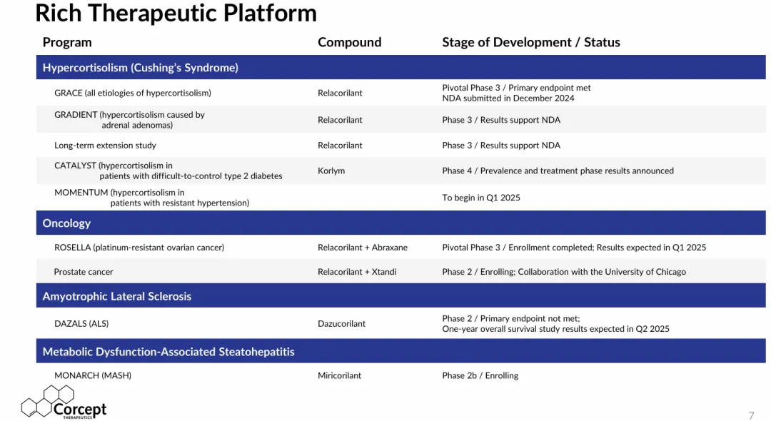 25年来,Corcept专注于皮质醇调节及其治疗各种严重疾病患者的潜力,已经发现了1000多种专有的选择性皮质醇调节剂和GR拮抗剂。Corcept正在对皮质醇增多症、实体瘤、ALS和肝病患者进行高级临床试验。2012年2月,该公司推出了Korlym®(米非司酮),这是美国FDA批准的第一种治疗内源性皮质醇增多症患者的药物。