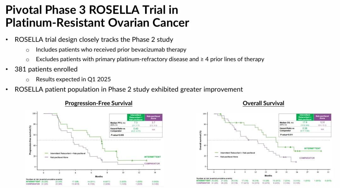 ROSELLA试验在美国、欧洲、韩国、巴西、阿根廷、加拿大和澳大利亚招募了381名抗铂卵巢癌症患者;不需要选择生物标志物。患者以1:1的比例随机分配,接受Relacorilant联合白蛋白紫杉醇或单独服用白蛋白紫杉醇。ROSELLA有两个主要终点——PFS-BICR和OS。如果任一终点都得到满足,则可以获得积极的结果。