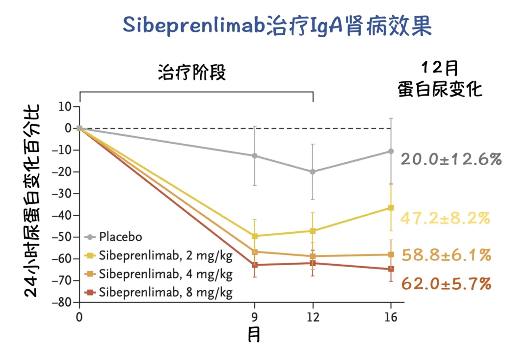 根据临床二期 ENVISION临床试验:在第12个月时,与基线相比,接受2、4和8 mg/kg剂量的sibeprenlimab各组患者24小时尿蛋白/肌酐比值(UPCR)的几何平均比值降幅分别为47.2%、58.8%和62.0%,安慰剂组为20.0%。