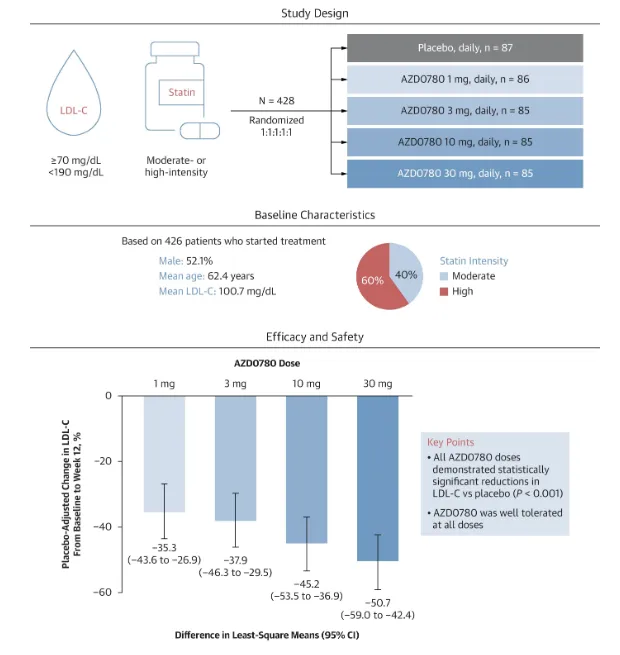 在最近于美国伊利诺伊州芝加哥举行的美国心脏病学会(ACC)年度科学会议及展览会上,阿斯利康公司公布了一项名为PURSUIT的IIb期临床试验的积极结果,并同时在《美国心脏病学会杂志》(JACC)上发表。这项研究展示了其研究药物AZD0780在标准治疗基础上的显著疗效,特别是在降低低密度脂蛋白胆固醇(LDL-C)水平方面。