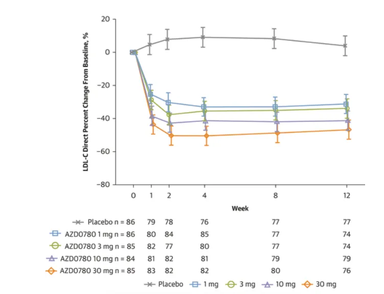在12周时,与安慰剂组相比,每日一次服用30mg AZD0780(在标准他汀治疗基础上,无需禁食或饮食限制)可使LDL-C水平降低50.7%(95%置信区间:-59.0%,-42.4%;p<0.001)。