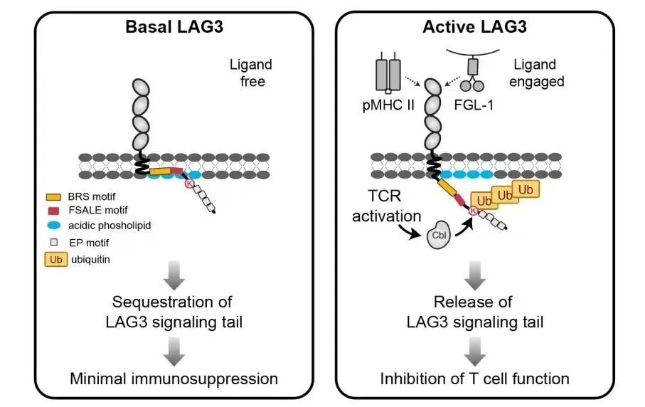2025年《细胞》研究揭示,LAG-3在配体结合后发生K498位点的泛素化修饰,导致关键信号元件从细胞膜中释放,激活免疫抑制功能。LAG-3抑制剂通过阻断这一过程,恢复T细胞抗肿瘤活性。