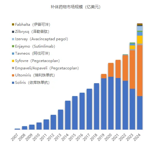 补体药物研发如火如荼,其商业价值也在持续兑现,2024年全球补体药物市场规模已扩张至81.83亿美元。在未来可预见的高增长态势下,这一数字突破百亿美元不在话下。