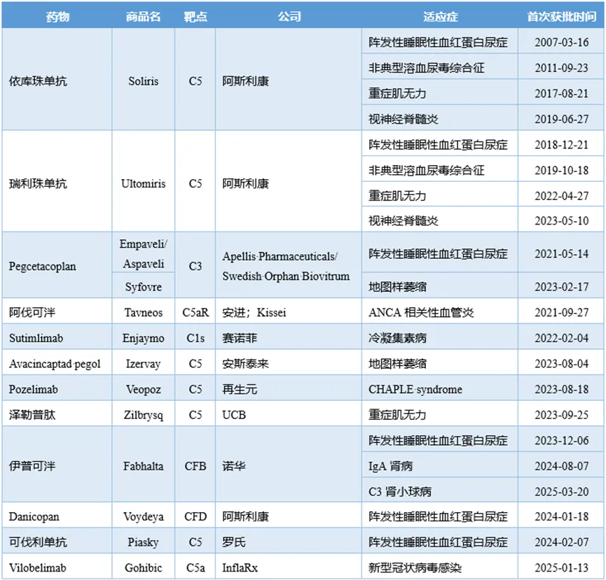 已获批上市的补体药物