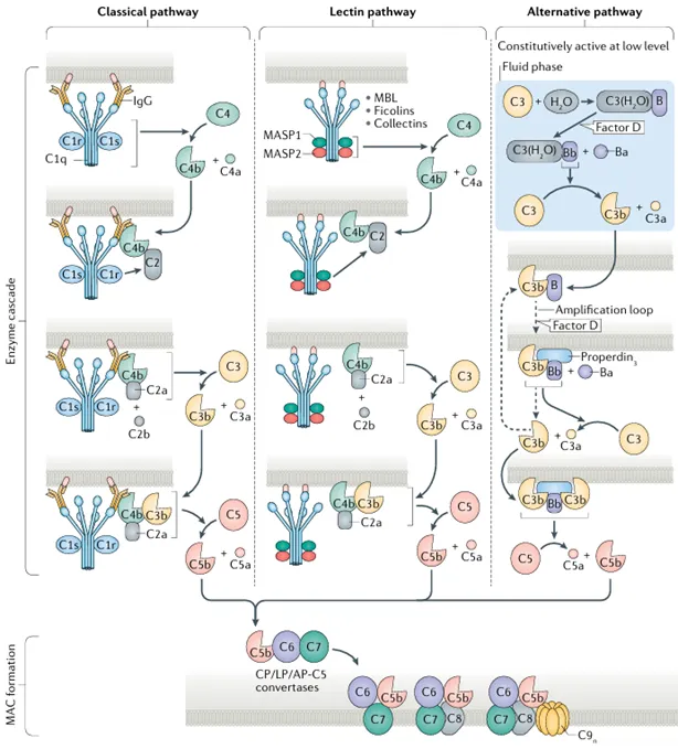 在Bordet的开创性工作之后,科学家们陆续发现了30余种补体成分,并逐步揭示了补体系统的级联反应机制。简而言之,补体主要通过经典途径、甘露聚糖结合凝集素(MBL)途径和旁路途径激活,形成膜攻击复合物(MAC),进而介导免疫反应的发生,从而清除病原体。
