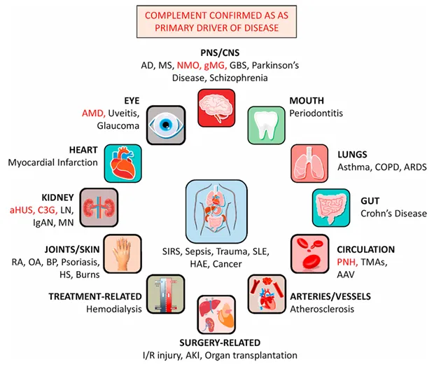 随着科学认知的深化,补体系统的“跨界”潜力逐渐显现。补体系统在免疫调节、炎症反应和组织损伤中的核心地位,使其成为众多疾病的潜在治疗靶点,远超最初的罕见血液疾病范畴。