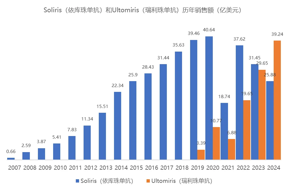 十年后,Ultomiris(瑞利珠单抗)作为Soliris(依库珠单抗)的升级版面世,将给药周期从2周延长至8周,大大减轻了患者的治疗负担。随着疾病谱的扩大及市场渗透,Ultomiris(瑞利珠单抗)的销售额已经在2024年反超一代产品。两代C5产品的成功也使得其开发商Alexion Pharmaceuticals声名鹊起,最终被阿斯利康以390亿美元的高价收购。这一交易充分彰显了资本对补体赛道战略价值的认可。