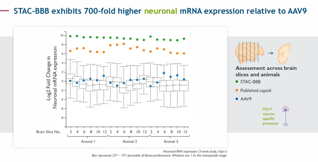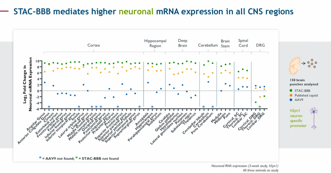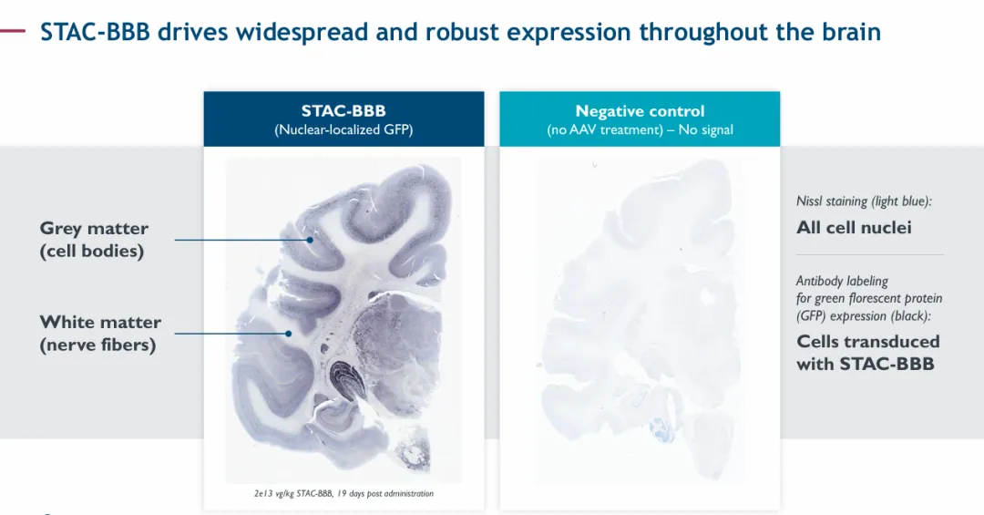 根据官方数据,STAC-BBB 已在非人灵长类动物中显示出穿越血脑屏障和神经元转导的能力。相较于传统 AAV9 衣壳,该衣壳驱动的转基因在神经元中的表达效率提升了 700 倍,且能广泛覆盖多个关键脑区,如大脑皮层、海马体等。