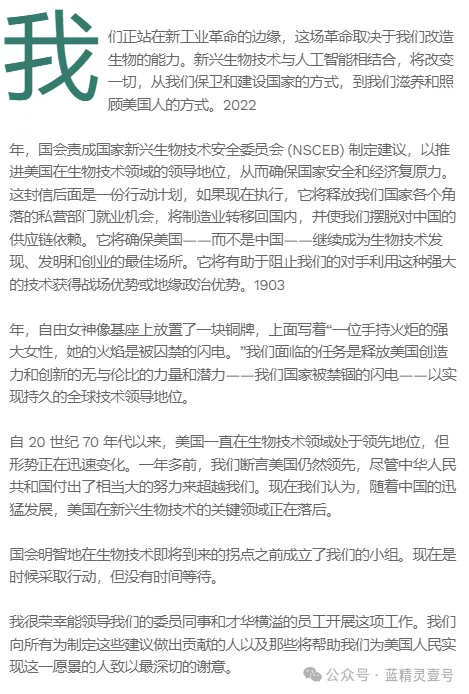 昨天美国一个两党委员会发布了一份报告(文末阅读全文跳转原文地址),建议政府投资 150 亿美元加强美国在生物技术领域的领导地位,并防止中国取得领先地位。这份文件向公众公布,列出了一系列“让美国创新更快,减缓中国创新速度”的建议。