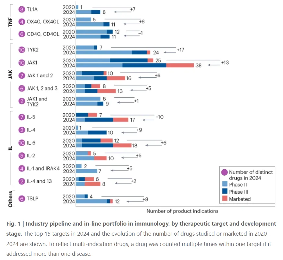 过去几年,最显著的进展发生在靶向TNF-α以外的TNF超家族成员的药物中:在2020年,CD40/CD40 ligand axis是少数处于III期临床的此类靶点;到2024年,靶向OX40、TL1A(TNF-like ligand 1A)等靶点的药物均推进到III期临床阶段。例如TL1A抑制剂正在被开发用于治疗克罗恩病和溃疡性结肠炎。