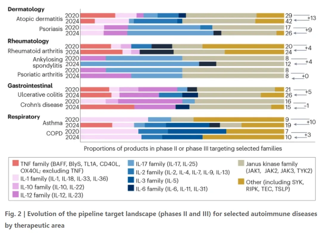 在免疫级联的下游,与银屑病和克罗恩病有关的IL-12和IL-23途径的TYK2抑制剂正在获得研发动力,因为相比JAK抑制剂,TYK2抑制剂避免了对造血作用的影响。