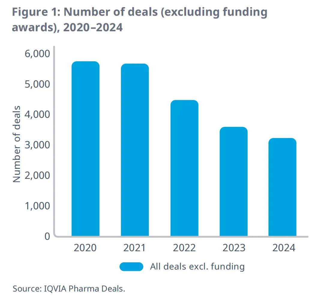 与2023年情况类似,2024年生命科学领域的交易活动依然低迷,由于市场状况持续不明朗,交易各方仍持谨慎态度。根据IQVIA Pharma Deals数据库中公开披露的交易活动数据(图1),2024年生命科学领域签署的交易协议总数较2023年下降了10%,较2020年的峰值水平下降了44%(不包括融资)。