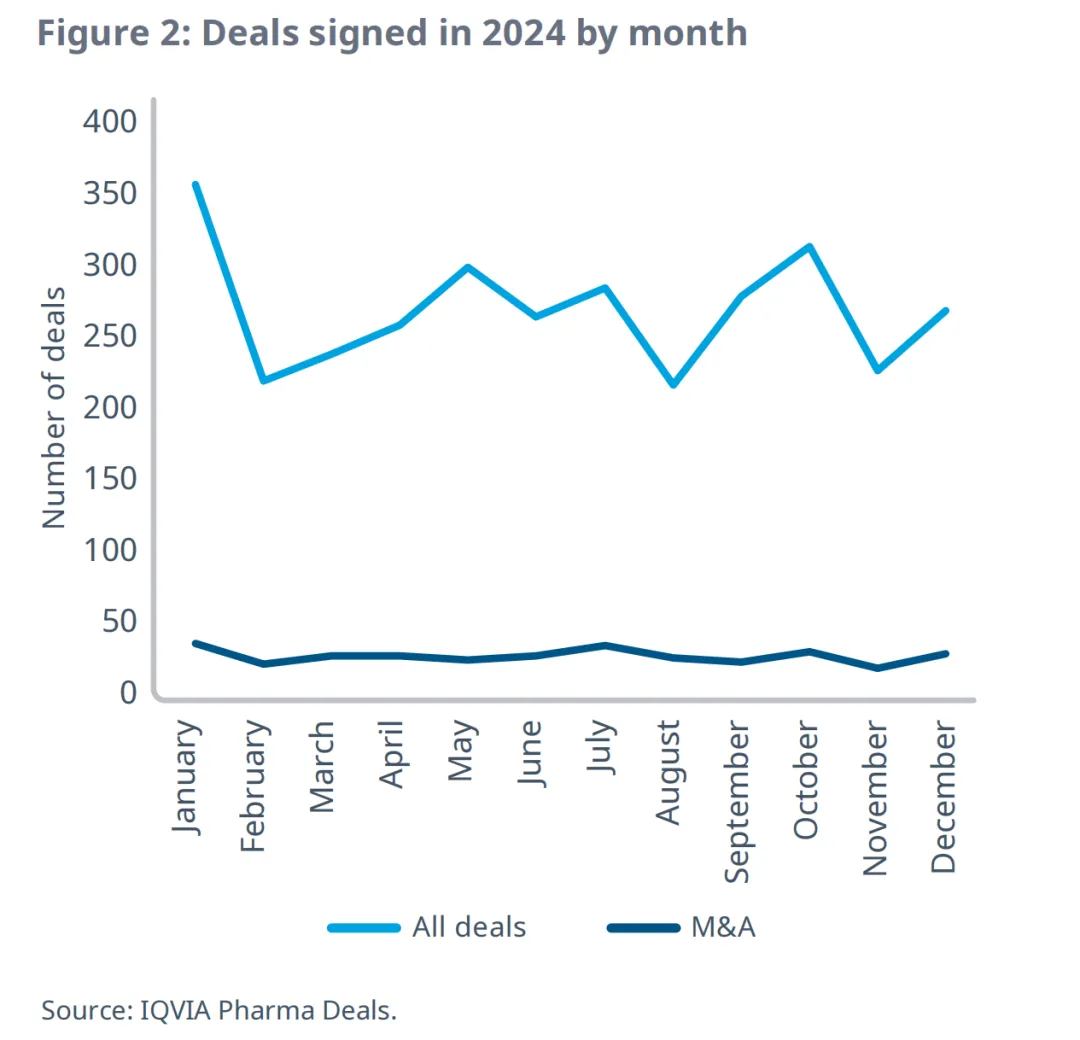 与过去几年趋势一样,2024年第一季度交易总量最高,随后全年逐渐放缓,而并购活动则全年保持稳定(图2)。