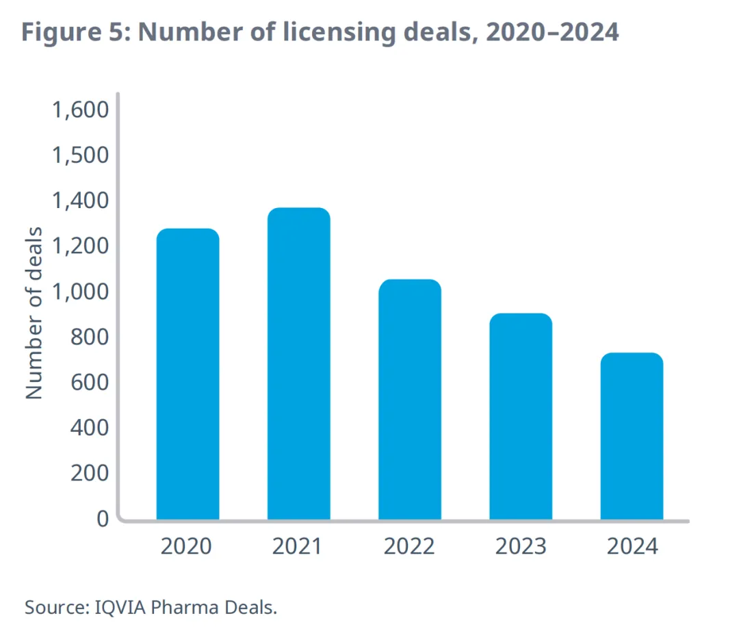 2024年,生命科学领域的授权交易活动进一步减少,大型制药公司在引进资产方面仍保持谨慎选择。生命科学领域的授权交易数量从2023年到2024年下降了18%,略高于整体交易活动的降幅,交易方出于谨慎,重新调整了投资组合,仅在高增长领域进行投资(图5)。