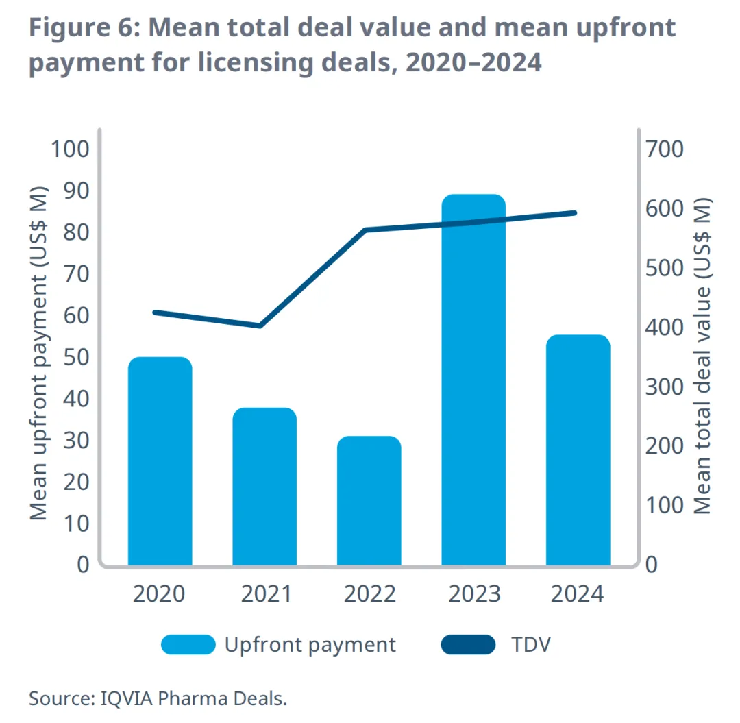 必须指出的是,2023年的交易额在很大程度上受到辉瑞以430亿美元收购Seagen的影响。而2024年披露的金额超过1亿美元的交易数量较多,除去异常值的总交易额中位数从2023年的1.08亿美元增至2024年的3.16亿美元,增幅高达193%(表1)。