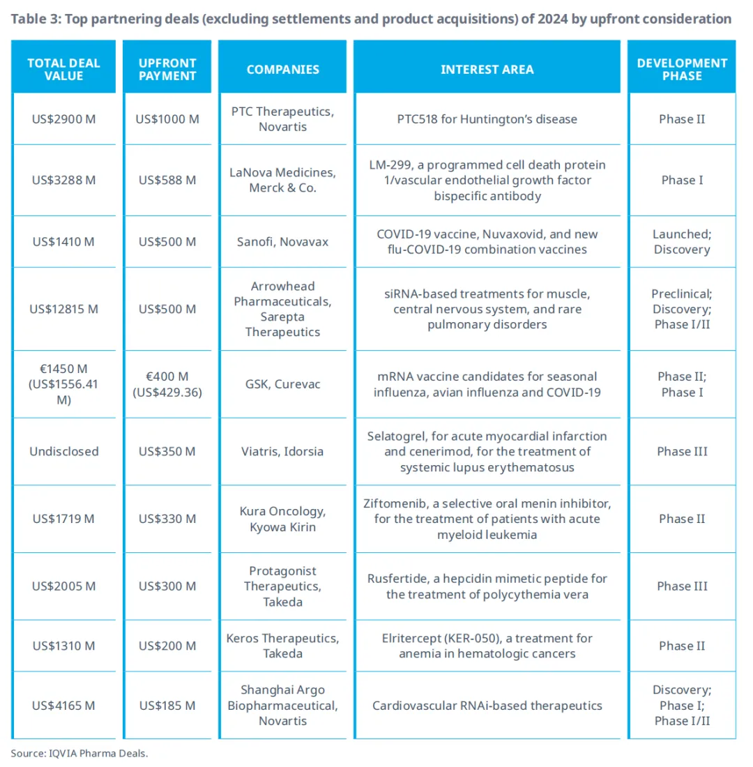 表3列出了2024年按总预付款(包括现金和股权)排名的前十大合作交易。尽管宏观经济形势依然严峻,但大型制药公司在2024年仍表现出愿意动用现金以获取有前景和创新性资产的意愿。与2023年类似,2024年有4笔授权交易的预付款达到5亿美元或以上。2024年预付款最高的授权交易是诺华以10亿美元预付款获得PTC