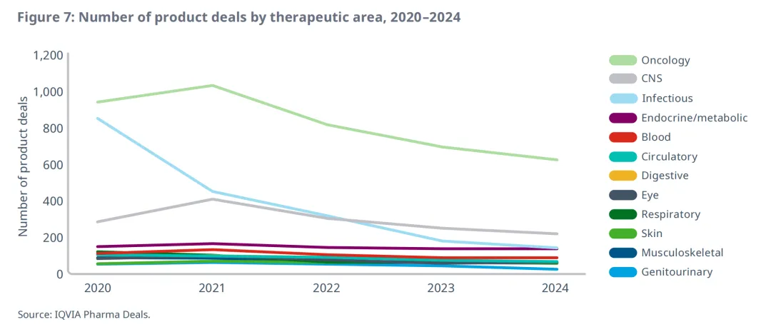从2023年到2024年,在分析涵盖的12个治疗领域中,有9个领域的交易活动出现下降,其中传染病和泌尿生殖系统疾病领域的降幅最大,分别为20%和36%。