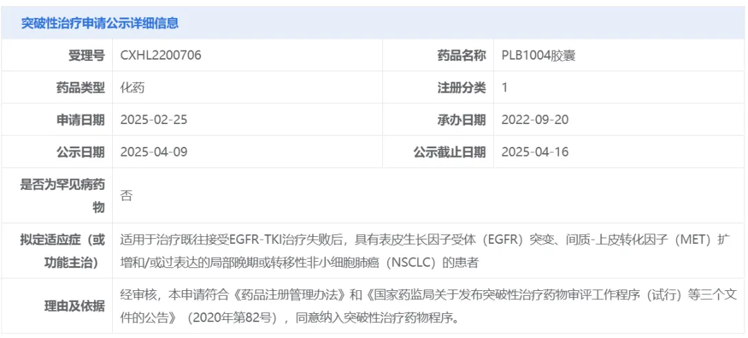 在2024年世界肺癌大会(WCLC)上,研究人员公布了一项1/2期临床研究结果,该研究评估了PLB1004+c-MET抑制剂vebreltinib,在EGFR突变阳性、MET扩增或过表达的EGFR-TKI后NSCLC患者中的疗效和安全性。这也正是该产品本次拟纳入突破性治疗品种的适应症。