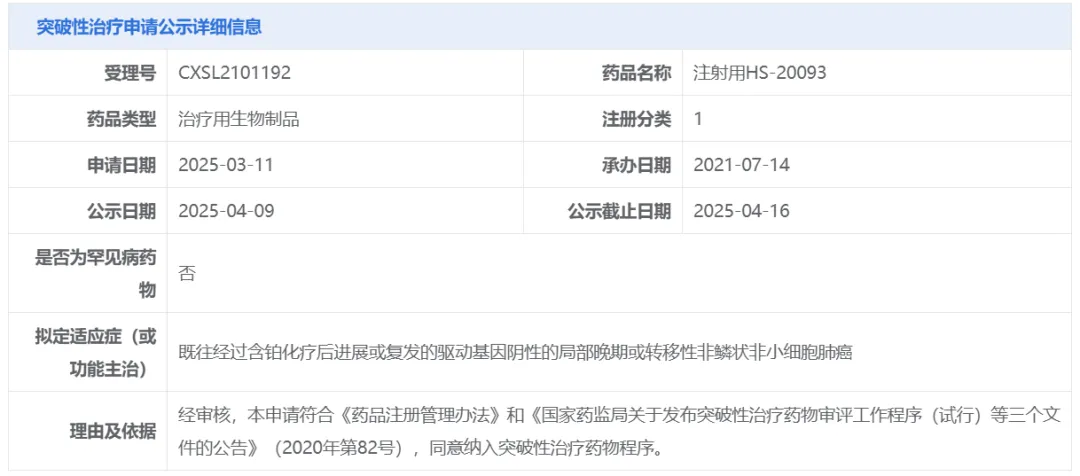 此前,HS-20093已经获美国FDA授予突破性疗法认定,用于治疗广泛期小细胞肺癌、骨肉瘤;被中国NMPA纳入突破性治疗品种,用于治疗广泛期小细胞肺癌、骨肉瘤;被欧洲EMA授予优先药物认定,用于治疗广泛期小细胞肺癌。