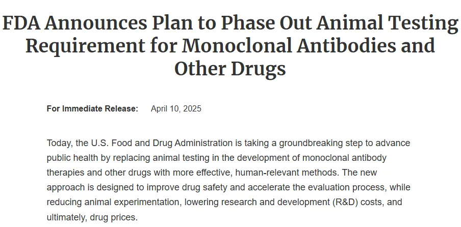 4月10日,美国FDA采取了一项开创性的举措,通过用更有效且与人类更相关的方法替代单克隆抗体疗法和其他药物开发中的动物实验,以推进公共健康。这种新方法旨在提高药物安全性,加快评估过程,同时减少动物实验,降低研发成本,最终降低药品价格。