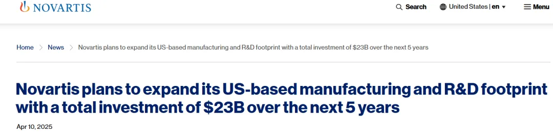 4 月 10 日,诺华宣布计划在未来五年内投资 230 亿美元,用于美国基础设施建设,确保所有面向美国患者的诺华关键药物均在美国生产。美国是诺华的重要市场。未来 5 年,诺华预计对美国业务的总投资将接近 500 亿美元。