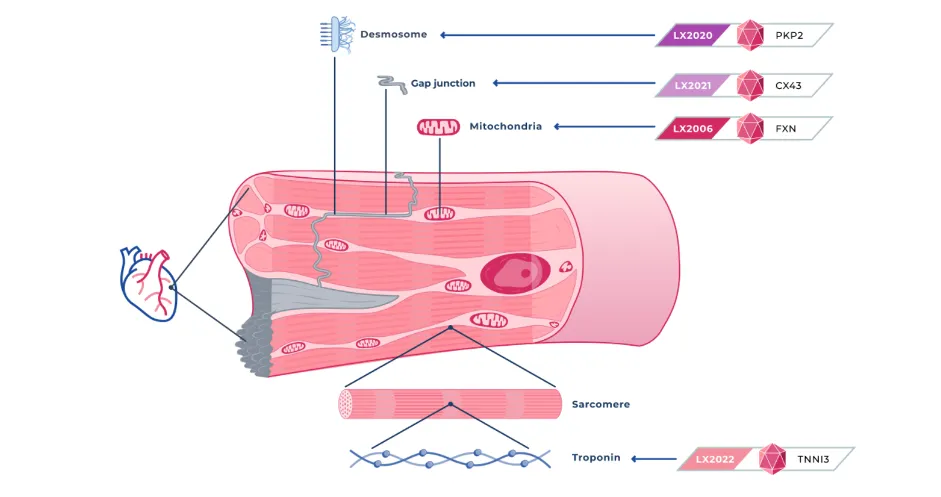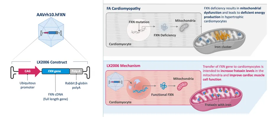 在评估LX2006的SUNRISE-FA 1/2期临床试验(NCT05445323)和Weill Cornell Medicine研究者发起的1A期临床试验(NCT05302271)中, 经LX2006治疗后,FA心肌病患者左心室的大小和厚度减少四分之一,并且所有参与者的心脏活检都观察到frataxin蛋白在心脏中表达增加。