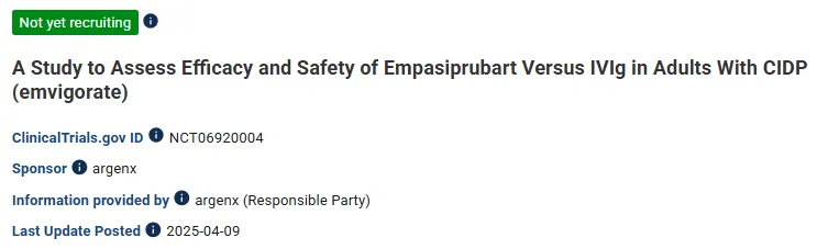 此前,Empasiprubart已在II期研究(ARDA)中初步完成了疗效验证。结果显示,多灶性运动神经病(MMN)患者接受治疗后,IVIg复治风险降低了91%,并且握力和肌肉力量得到改善。基于此,Argenx在2024年12月启动了Empasiprubart治疗MMN的III期临床试验。