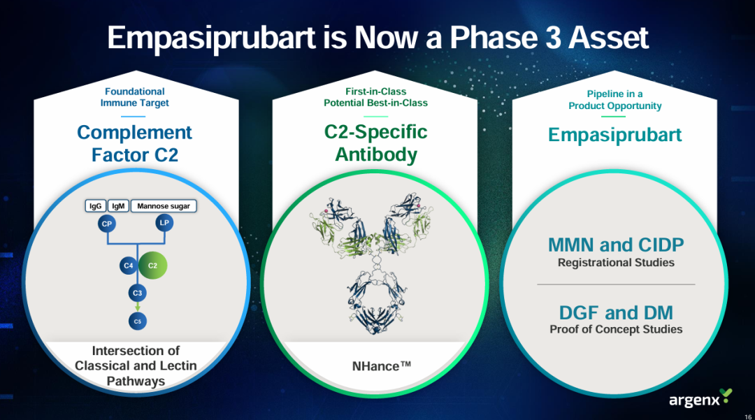 Empasiprubart是Argenx开发的一款靶向补体C2的first in class人源化单抗,通过结合补体C2阻断补体级联反应中的经典途径和凝集素途径的激活,并且不影响替代途径,从而减少组织炎症和正常细胞损伤,并保留抗菌功能。
