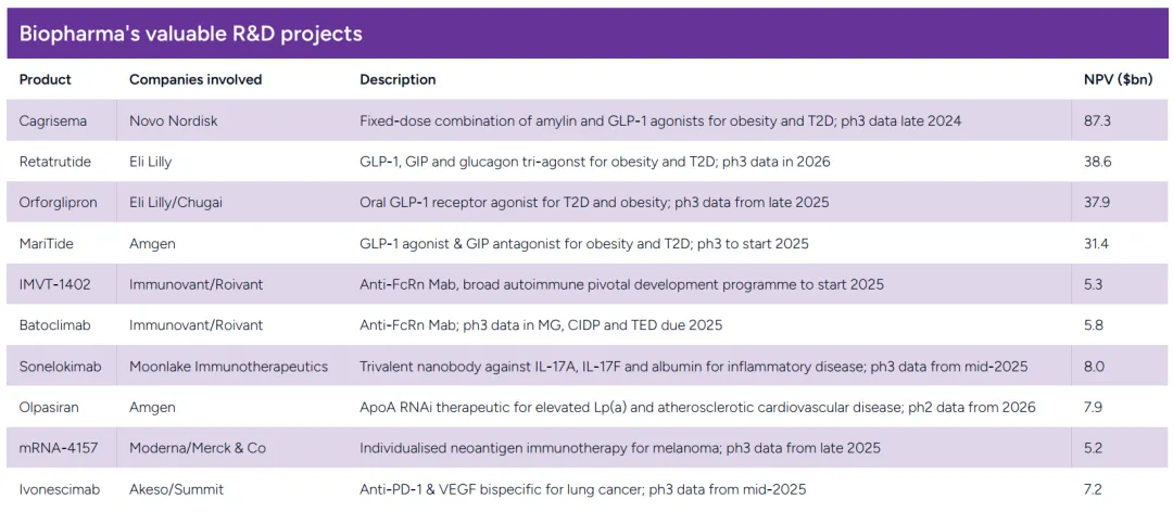 今年Evaluate Pharma对Biopharma的未来潜力管线进行了预测,其中大部分药物都是治疗代谢疾病的,主要是GLP-1类药物,有三款免疫药物,即IMVT-1402、Batoclimab和Sonelokimab,另有两款RNA类药物,包括Olpasiran和 mRNA-4157以及一款肿瘤药物Ivonescimab。一款药物的成功不仅使患者受益,也能使企业得到丰厚的回报。