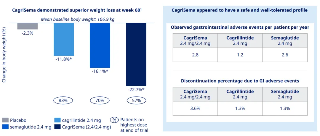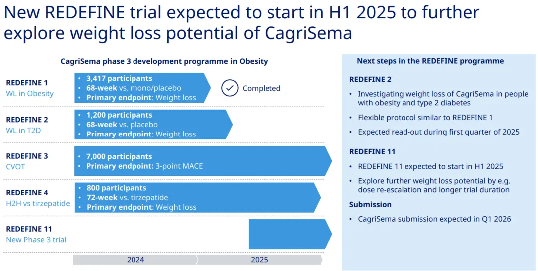 2024年12月,诺和诺德宣布了全球REDEFINE计划的3期试验 REDEFINE 1 的主要结果:安慰剂相比,CagriSema在第68周时的体重减轻具有统计学意义且更好,从而达到了其主要终点。