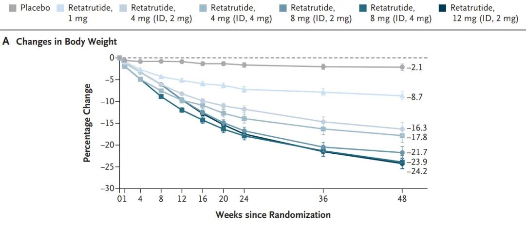 Retatrutide 的一项2期研究结果显示:在48周时,retatrutide在1 mg组中使受试者体重下降8.7%,在联合 4 mg 组下降17.1%,8 mg联合组下降22.8%,12 mg组下降24.2%,而安慰剂组下降2.1%(图6)[5]。